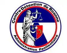 Marqué « centre de détention de Roanne », il reprend l'inscription « administration pénitentiaire » sur fond azur. Il est orné des symboles de la justice qui sont représentés ici par une femme aux yeux bandés, en référence à la déesse Thémis, déesse de la justice, de la loi et de l'équité, tenant dans sa main droite un glaive et dans sa main gauche une balance.