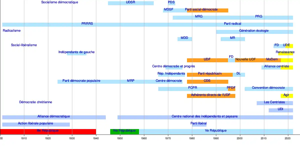 | Union pour la démocratie française | 1978-2007 | Jean Lecanuet, Valéry Giscard d'Estaing | François Léotard, François Bayrou | Parti fondateur du MoDem en 2007 (sans activité réelle depuis, sa disparition définitive étant fixée à 2010). |