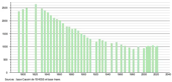 L'évolution du nombre d'habitants est connue à travers les recensements de la population effectués dans la commune depuis 1793. Pour les communes de moins de 10 000 habitants, une enquête de recensement portant sur toute la population est réalisée tous les cinq ans, les populations légales des années intermédiaires étant quant à elles estimées par interpolation ou extrapolation[37]. Pour la commune, le premier recensement exhaustif entrant dans le cadre du nouveau dispositif a été réalisé en 2004[38].