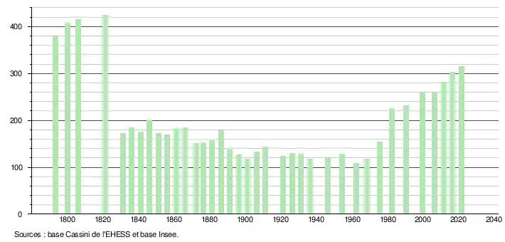 L'évolution du nombre d'habitants est connue à travers les recensements de la population effectués dans la commune depuis 1793. Pour les communes de moins de 10 000 habitants, une enquête de recensement portant sur toute la population est réalisée tous les cinq ans, les populations légales des années intermédiaires étant quant à elles estimées par interpolation ou extrapolation[18]. Pour la commune, le premier recensement exhaustif entrant dans le cadre du nouveau dispositif a été réalisé en 2006[19].