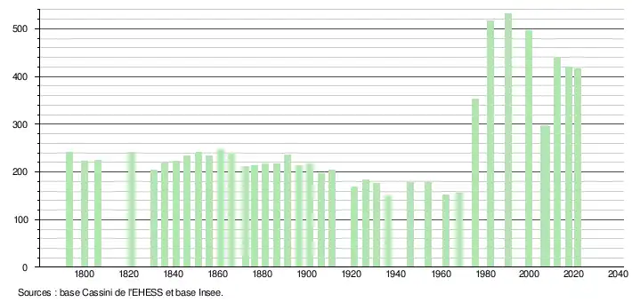 L'évolution du nombre d'habitants est connue à travers les recensements de la population effectués dans la commune depuis 1793. Pour les communes de moins de 10 000 habitants, une enquête de recensement portant sur toute la population est réalisée tous les cinq ans, les populations légales des années intermédiaires étant quant à elles estimées par interpolation ou extrapolation[20]. Pour la commune, le premier recensement exhaustif entrant dans le cadre du nouveau dispositif a été réalisé en 2007[21].
