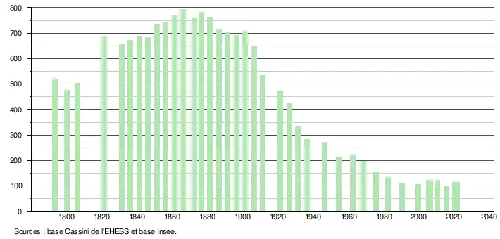 L'évolution du nombre d'habitants est connue à travers les recensements de la population effectués dans la commune depuis 1793. Pour les communes de moins de 10 000 habitants, une enquête de recensement portant sur toute la population est réalisée tous les cinq ans, les populations légales des années intermédiaires étant quant à elles estimées par interpolation ou extrapolation[34]. Pour la commune, le premier recensement exhaustif entrant dans le cadre du nouveau dispositif a été réalisé en 2005[35].