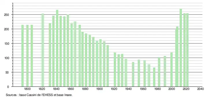 L'évolution du nombre d'habitants est connue à travers les recensements de la population effectués dans la commune depuis 1793. Pour les communes de moins de 10 000 habitants, une enquête de recensement portant sur toute la population est réalisée tous les cinq ans, les populations légales des années intermédiaires étant quant à elles estimées par interpolation ou extrapolation[21]. Pour la commune, le premier recensement exhaustif entrant dans le cadre du nouveau dispositif a été réalisé en 2007[22].