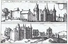 Nous n’avons, à ce jour, qu’une seule représentation du château de Moulidars, probablement Ardenne, qui nous est due à Claude Chastillon (1560-1616), ingénieur du roi : la gravure représentant Ardenne en 1603. L’abbé Tricoire attribue cette gravure, dans son livre, à la métairie de la Cour, anciennement château de la Cour, mais il est possible qu’il se soit trompé. Tout ce qu’il nous reste aujourd’hui des deux châteaux nous porte à croire que c’est Ardenne qui est représenté, mais il y aura toujours un petit doute. Certains évoquent même la possibilité que Chastillon ait fait un mélange des deux châteaux. Mais n’oublions pas qu’en 1603, c’est Ardenne le château de Moulidars, même si la métairie de la Cour devait avoir gardé son aspect de château[10].