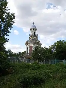 Il fait appel à Léon de Sanges pour rebâtir la pompe à feu qui alimente en eau le domaine et pour aménager une nouvelle entrée à l'est du parc, plus pratique pour accueillir ses invités venus de Paris : deux imposantes grilles en fer forgé aux extrémités dorées et un élégant pavillon en pierre de style rocaille, avec à l'extérieur un vaste rond-point en demi-lune[29]. Hertford achète une quantité de statues, de colonnes et de vases qu'il installe dans le parc pour remplacer ceux qui ont disparu, dont des œuvres de Houdon. En dehors du kiosque chinois, il installe sur une pelouse une autre fabrique : un pagodon, provenant de l'Exposition universelle de 1867 ; lors de la vente du site à la ville de Paris en 1905, le pagodon est racheté et déménagé outre-Manche sur le domaine de Cliveden, au sein du Water Garden. L'actuelle pagode de Bagatelle est une copie de l'original installée en 1996[30].
