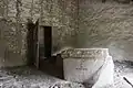 Escalier menant à la geôle médiévale. Celle-ci a été fortifiée par l'Occupant Allemand pour en faire un abri face aux bombes des Alliés.