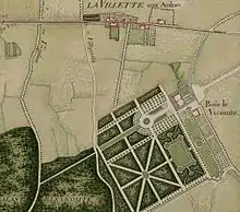 Pour ce que pour aller de Paris à Bois le Viconte qui en est eslongné de 5 lieues on ne passe autre village que La Vilette, hameau dépendant du prieuré Saint-Lazare, à une demi lieue du fauxbourg Saint-Martin par où il faut sortir : nous irons droictement, sans nous arester, le grand chemain qui est pavé, et relevé soigneusement de chaussées dans les vallées, et lieux marescageux. Cette voye est fort fréquentée à cause des coches de Meaux, chasteau Thiery, Metz, Nancy, et d'autres villes qui y passent, aymants mieux laisser le droict chemin qui est par Pentin, Livri, Vaujour, ville parisis, à cause d'une forest continuelle qu'il faudroit passer, dangereuse parfois, et selon les saisons. Quoyque par ceste espace de 5 lieues on ne trouve (comme nous avons dit) aucun village [...] est [...] néanmoins qu'à qui le cœur faudroit ne seroit pas besoing de se destourner plus d'un quart de lieue pour en trouver de fois à autres, et s'y pouvoir rafraischir. Donc sans nous amuser nous irons descendre à une seconde Villette distante d'un demi quart de lieue seulement de Bois le Viconte, à une bonne hostelerie qui prend pour enseigne la Chasse Royalle, où se rafraischissent les coches en passant, et où on est très bien, et nettement traicté, estant le logis guay, et en bel air, et orné d'une grandeur cour, d'un bois, et jardin. Ensuite de quoy après une petite traverse de champs labourez, et remplis de très bons froments, nous sommes arrivez au chasteau qui est de fort belle apparence.