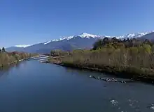 Vue de la confluence de l'Arc et de l'Isère depuis le pont Royal avec la colline où se dresse le château de Chamousset sur la droite ; au fond, le massif de la Lauzière.