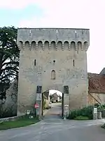 C'est une tour carrée, la plus haute du château avec ses 20 mètres, placée au milieu de la courtine nord. Elle constitue la seule porte de l'enceinte, protégée par une herse en bois, côté extérieur, et une porte à deux battants, côté cour. Elle est renforcée de contreforts dont la partie basse a été rendue plus massive ultérieurement. À la différence du reste du château, la maçonnerie est de moyen appareil et de bonne qualité.