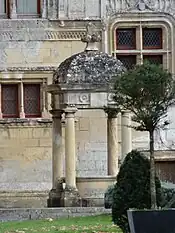 Un fronton triangulaire classicisant est plaqué sur la Tourelle médiévale. Un fronton triangulaire classicisant est plaqué sur la Tourelle médiévale.