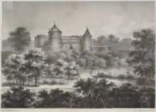 Le château selon une lithographie de Prosper de la Barrière (1823).