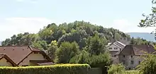 Église Saint-Nicolas, ferme et butte où se situent les ruines du château de Hauteville | |||