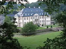 Les deux pavillons de la cour d'honneur sont de Nagel, inspiré par Wehmer. Celui à l'ouest est décoré du double blason matrimonial des Weichs et des Westrem et date de 1731 ; celui du côté est est orné du blason des Weichs et des Galen et date de 1743. La remise du sud est couronnée d'un petit clocheton. le milieu du bâtiment de l'économat à trois étages est dominé par un fronton d'entrée. L'aile ouest consiste en corps de garde à portail (Torhaus) datant de 1736 et surélevé en 1850. Le parc à terrasses à fondement de paraboles est accessible par un petit pont.