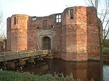 Seules la guérite et la tour ouest subsistent encore, partiellement intactes. La guérite est à l'origine protégée par un pont-levis et une herse[39]. La guérite est rectangulaire, construite en brique avec des détails en pierre, avec quatre tourelles polygonales[40]. S'il avait été achevé, il aurait pu faire 30 mètres de hauteur et ressembler à la guérite de la tour Layer Marney[30]. Au rez-de-chaussée, deux chambres, dont la loge du concierge, encadrent le passage de la porte[41]. Le premier étage abrite le mécanisme de la herse et une garde-robe[41]. Si le deuxième étage a jamais été achevé, il a depuis été perdu[41]. La tour ouest mesure 25 pieds à travers l'extérieur et 18 pieds à l'intérieur, en maçonnerie à motifs simples, avec trois étages et deux tourelles légèrement plus hautes dans les coins intérieurs[42]. Chaque étage comporte une seule chambre, avec une cheminée et une garde-robe adjacente, qui auraient constitué des logements pour les membres les plus âgés de la maison[43].