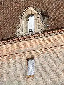 La seconde phase de travaux a peut-être concerné la grange monumentale qui coupe la cour en deux, avec du côté du château la grande cour d'honneur, et de l'autre la basse-cour avec le pigeonnier. On distingue au moins trois périodes de construction différentes pour la grange : une moitié très homogène qui va du pont-levis à l'arcade ouvrant sur la basse-cour, puis une partie en briques plus rouges et plus épaisses, et enfin l'extrémité du bâtiment qui retrouve une brique plus orangée. Toutes les hypothèses sont plausibles, mais il se pourrait : soit qu'un autre bâtiment existait au niveau de la partie en briques rouges, peut-être un autre pont-levis (qui aurait permis d'avoir une route droite partant du village et allant jusqu'au deuxième pont-levis du château). Ce bâtiment aurait alors été détruit afin d'harmoniser la façade de la grange. Soit que cette partie de la grange se serait écroulée et aurait été reconstruite. Quoi qu'il en soit, on observe un souci d'harmonisation des façades de cette cour, puisque les motifs losangés en brique se retrouvent partout.