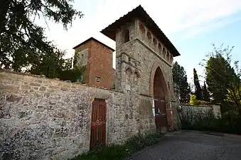 On accède au complexe par un portail néogothique à arc brisé, qui remonte aux travaux des XIXe et XXe siècles, les mêmes qui enfermaient le parterre, un petit jardin à l'anglaise.