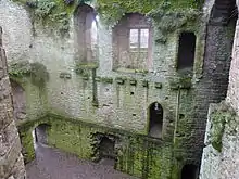 Le corps de garde occupe l'emplacement du château anglo-normand originel. Lors de la construction du château, on creusa un fossé dans le rocher et les pierres ainsi récupérées servirent à construire les murailles. On accédait au château fort par une porte fortifiée, percée dans le rempart sud, qui pourrait remonter aux années 1080[19]. Il semble à son aspect que cette porte fortifiée servait de logement, en particulier la pièce aménagée au-dessus du passage d'entrée. L'arc brisé de l'entrée fut ultérieurement muré et cette grade porte convertie en donjon[21]. La création de l'enceinte intérieure au sud au XIIIe siècle montre aussi que la grande porte n'était plus à cette époque l'entrée vers l'enceinte : on avait aménagé à cet effet une nouvelle porte à l'est du donjon[22]. L'enceinte intérieure abrite les corps de logis du château : ils sont ajourés de larges baies qui donnent sur la cour.