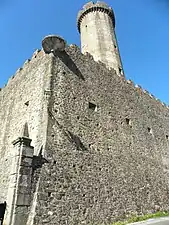 La tour, datant probablement du XIIe siècle, mesure plus de 25 m de haut et est située du côté ouest du château. De forme circulaire et flanquée d'une construction fortifiée de plan rectangulaire, elle est dotée de six salles voûtées superposées reliées par des trappes par des escaliers escamotables, avec la saillie supérieure sur des encorbellements en pierre.