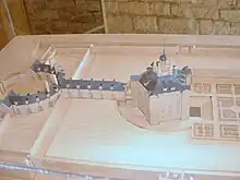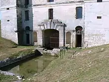 La pièce centrale des communs, qui existe encore, était bâtie dans l'axe de la galerie et en constituait le vestibule d'entrée. Le dessin de Du Cerceau montre une galerie à étage avec cinq arcades, menant à un pont dormant soutenu par quatre colonnes puis à une passerelle, sans doute mobile. De là, par-dessus les douves sèches, on accédait au logis par une porte située dans la tour nord.