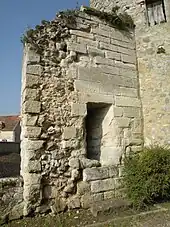 - la porte fortifiée au sud-ouest, entre deux tours en fer à cheval, construite au début du XIIIe siècle et remaniée à la fin du XVe siècle ;