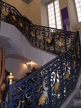 L'escalier à rampe de fer forgé aux motifs dorés à la feuille.