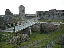 L'accès à la haute-cour était gardé par un châtelet d'entrée avec une passerelle. Celle-ci va connaître plusieurs phases : dans une première, au XIIIe siècle, la passerelle s'appuie sur trois piles de soutien, peut-être doublées par un pont-levis manipulé depuis le châtelet. La première pile côté basse-cour se voit transformée en culée aux alentours du XVe siècle[57]. Enfin, plus tard, la première pile côté haute-cour est elle aussi transformée en culée, traduisant l'abandon d'un éventuel pont-levis dans une période plus moderne[58].