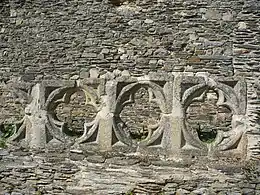 Vestige du Grand logis. Au centre, la cheminée, encadrée par les fenêtres à coussièges. Vestige du Grand logis. Au centre, la cheminée, encadrée par les fenêtres à coussièges.