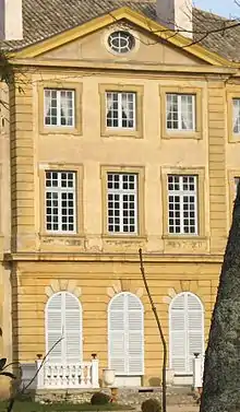 L'avant-corps de la façade sud comprend trois travées. Le rez-de-chaussée, en bossage continu en table, est percé de trois baies en plein cintre. Il est couronné d'un fronton percé d'un oculus.