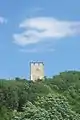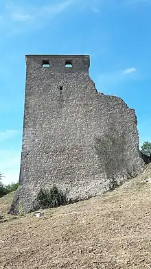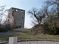 Tour en pierre de Saint-Denis-en-Bugey (vue nord-est), vestige de la bâtie de Chausson, construite en 1326 par le dauphin Guigues VIII de Viennois, dans un contexte de conflit delphino-savoyard.
