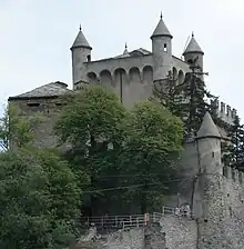 De l'extérieur, il présente un corps central unique presque rectangulaire, avec plusieurs édifices bâtis à de différentes époques. Du côté nord, ils s'élèvent à pic sur l'éperon, du côté sud, s'ouvre une petite cour entourée d'une enceinte crénelée. L'élément principal est le donjon central, surmonté par quatre tours circulaires décoratives, liées entre elles par une cheminée faisant partie du projet de restauration de Camille Boggio (fin du XIXe siècle).