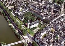- Vu panoramique de Tours au début du XVIIe siècle, dont le château de Tours et le pont d'Eudes