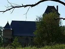 - Vers la fin du XIVe siècle, un étage est ajouté au-dessus de la grande salle et permet d'installer une salle haute[5] suivie d'une chambre carrée qui existe encore. Les ouvertures de la grande salle sont remaniées; une tour de latrines est construite à l'angle sud-est de la grande salle et dessert, via une galerie extérieure, les deux pièces de l'étage.