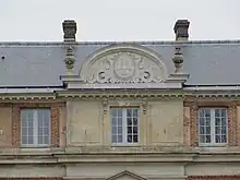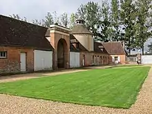 Extérieurement, le château est constitué d'un grand corps central à trois niveaux, en brique rose. L'avant-corps central en pierres de taille a été remanié sous la Restauration[5]. Il est étroit et limité à la travée axiale, il dispose d'un balcon au premier étage, soutenu par des colonnes jumelées. Mais surtout, le blason de la famille du Tillet, une croix pattée inspirée de la croix de Malte, a été ajouté sur le fronton et sur la grille d'entrée. Les deux pavillons latéraux en saillie sont surmontés d'un fronton percé d'un oculus, lui-même surmonté d'un toit au profil inhabituel : toit à la Mansart avec au-dessus une sorte de dôme à pans concaves. La façade arrière est plus simple. Quant à la cour d'honneur, délimitée par une grille de fer forgé, elle est encadrée par deux pavillons carrés coiffés d'une pittoresque toiture pyramidale. Sur la droite, les communs forment un bâtiment bas et long d'où émerge un colombier surmonté d'un lanternon, à côté d'un porche en plein cintre qui sert d'entrée à la basse-cour. Une chapelle privée[Note 1] a été construite vers 1887 ainsi qu'une orangerie vers 1889.