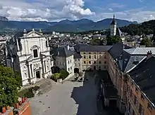 De l'intérieur de la cour intérieur : au centre les appartements privés, à droite les locaux abritant le conseil départemental de la Savoie, à gauche les locaux de la préfecture de Savoie.