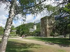 - Tour Sarrasine (donjon)[15] (XIIe siècle). La présence des Maures dans les environs et qui seraient à l'origine de la construction sont fausses[16]. Il s'agit plutôt d'une manière de donner un sens à une édification dont on a oublié les origines[16]. Ses angles sont renforcés d'un chaînage de pierres soigneusement appareillées[17].