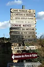 Panneaux signalant différents domaines de Châteauneuf-du-Pape.