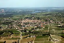 Vue aérienne du village de Châteauneuf-du-Pape sur sa butte.