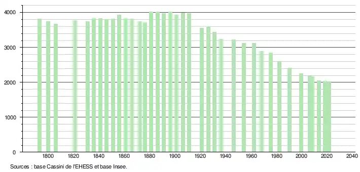 L'évolution du nombre d'habitants est connue à travers les recensements de la population effectués dans la commune depuis 1793. Pour les communes de moins de 10 000 habitants, une enquête de recensement portant sur toute la population est réalisée tous les cinq ans, les populations légales des années intermédiaires étant quant à elles estimées par interpolation ou extrapolation[30]. Pour la commune, le premier recensement exhaustif entrant dans le cadre du nouveau dispositif a été réalisé en 2008[31].