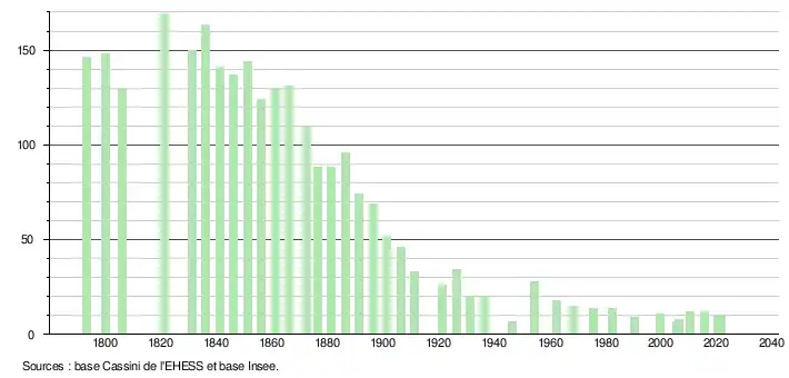 L'évolution du nombre d'habitants est connue à travers les recensements de la population effectués dans la commune depuis 1793. Pour les communes de moins de 10 000 habitants, une enquête de recensement portant sur toute la population est réalisée tous les cinq ans, les populations légales des années intermédiaires étant quant à elles estimées par interpolation ou extrapolation[20]. Pour la commune, le premier recensement exhaustif entrant dans le cadre du nouveau dispositif a été réalisé en 2005[21].