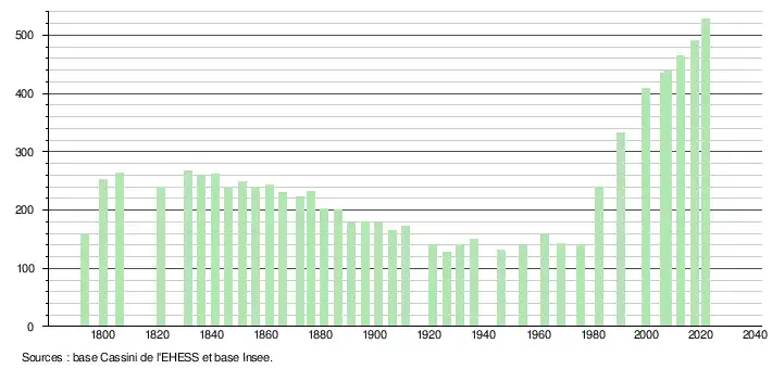 L'évolution du nombre d'habitants est connue à travers les recensements de la population effectués dans la commune depuis 1793. Pour les communes de moins de 10 000 habitants, une enquête de recensement portant sur toute la population est réalisée tous les cinq ans, les populations légales des années intermédiaires étant quant à elles estimées par interpolation ou extrapolation[20]. Pour la commune, le premier recensement exhaustif entrant dans le cadre du nouveau dispositif a été réalisé en 2007[21].