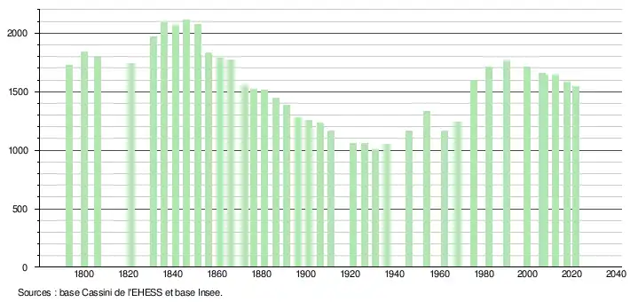 L'évolution du nombre d'habitants est connue à travers les recensements de la population effectués dans la commune depuis 1793. Pour les communes de moins de 10 000 habitants, une enquête de recensement portant sur toute la population est réalisée tous les cinq ans, les populations légales des années intermédiaires étant quant à elles estimées par interpolation ou extrapolation[20]. Pour la commune, le premier recensement exhaustif entrant dans le cadre du nouveau dispositif a été réalisé en 2007[21].