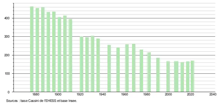 L'évolution du nombre d'habitants est connue à travers les recensements de la population effectués dans la commune depuis 1876. Pour les communes de moins de 10 000 habitants, une enquête de recensement portant sur toute la population est réalisée tous les cinq ans, les populations légales des années intermédiaires étant quant à elles estimées par interpolation ou extrapolation[41]. Pour la commune, le premier recensement exhaustif entrant dans le cadre du nouveau dispositif a été réalisé en 2007[42].