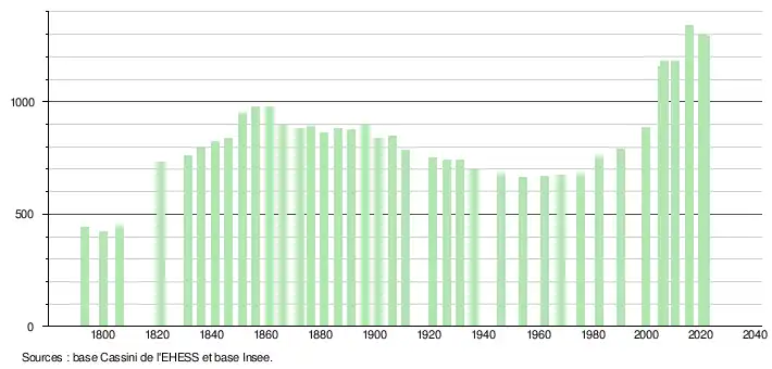 L'évolution du nombre d'habitants est connue à travers les recensements de la population effectués dans la commune depuis 1793. Pour les communes de moins de 10 000 habitants, une enquête de recensement portant sur toute la population est réalisée tous les cinq ans, les populations légales des années intermédiaires étant quant à elles estimées par interpolation ou extrapolation[18]. Pour la commune, le premier recensement exhaustif entrant dans le cadre du nouveau dispositif a été réalisé en 2005[19].