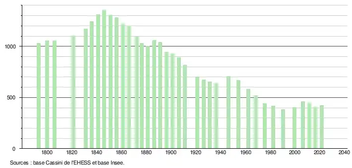 L'évolution du nombre d'habitants est connue à travers les recensements de la population effectués dans la commune depuis 1793. Pour les communes de moins de 10 000 habitants, une enquête de recensement portant sur toute la population est réalisée tous les cinq ans, les populations légales des années intermédiaires étant quant à elles estimées par interpolation ou extrapolation[17]. Pour la commune, le premier recensement exhaustif entrant dans le cadre du nouveau dispositif a été réalisé en 2006[18].