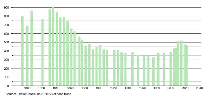 L'évolution du nombre d'habitants est connue à travers les recensements de la population effectués dans la commune depuis 1793. Pour les communes de moins de 10 000 habitants, une enquête de recensement portant sur toute la population est réalisée tous les cinq ans, les populations légales des années intermédiaires étant quant à elles estimées par interpolation ou extrapolation[18]. Pour la commune, le premier recensement exhaustif entrant dans le cadre du nouveau dispositif a été réalisé en 2004[19].