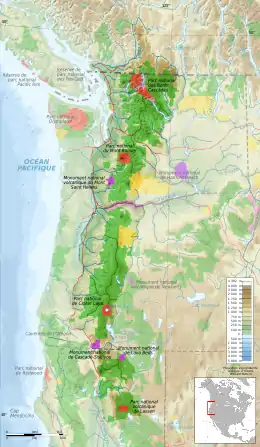 La chaîne des Cascades est un massif montagneux qui s'étend le long de la côte Ouest de l'Amérique du Nord, à une distance moyenne de 200 kilomètres de l'océan Pacifique, du Sud de la province de Colombie-Britannique au Canada jusqu'au Nord de la Californie aux États-Unis en passant par les États de Washington et de l'Oregon. Elle est limitée au nord par la rivière Thompson avant sa confluence avec le fleuve Fraser et au sud par le lac Almanor. Elle fait partie des chaînes côtières du Pacifique et se prolonge au nord par la chaîne Côtière et au sud par la Sierra Nevada[10]. Au-delà du plateau du Columbia, à l'est, selon un même axe nord/sud s'élèvent les montagnes Rocheuses. Sa seule bordure maritime se situe au niveau du Puget Sound au nord-ouest de l'État de Washington[11].