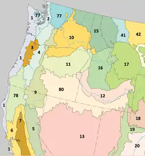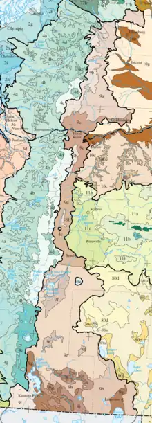 Le relief de la chaîne des Cascades scinde la région en deux zones géographiques distinctes : à l'est, l'Eastern Washington où s'étendent de hauts plateaux arides[12] formés il y a 16 millions d'années par de gigantesques coulées de laves[13] où le fleuve Columbia et ses principaux affluents, les rivières Snake, Yakima et Okanagan, ont sculpté d'impressionnants canyons[14] ; à l'ouest, la chaîne domine la plaine dépressionnaire du Puget Sound et les chaînes côtières de l'Oregon et des montagnes Olympiques.