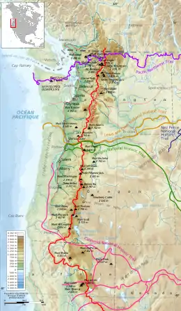 - (en) Northern Cascade Range, Washington Hiking Trails, Central Cascade Range, Oregon Hiking Trails, Southern Cascade Range, Oregon Hiking Trails