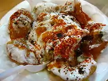 Les éléments communs parmi ces variantes sont le yaourt (dahi), les oignons émincés et la coriandre ; le sev (de fines nouilles jaunes séchées et salées) ; du chaat masala, contenant généralement de l'amchoor (de la poudre de mangue séchée), du cumin, du sel noir, de la coriandre, du gingembre séché, du sel, du poivre noir et du piment. Les ingrédients sont combinés et servis dans une petite assiette en métal ou une feuille de banane séchée façonnée en forme de bol.