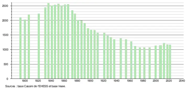L'évolution du nombre d'habitants est connue à travers les recensements de la population effectués dans la commune depuis 1793. Pour les communes de moins de 10 000 habitants, une enquête de recensement portant sur toute la population est réalisée tous les cinq ans, les populations légales des années intermédiaires étant quant à elles estimées par interpolation ou extrapolation[19]. Pour la commune, le premier recensement exhaustif entrant dans le cadre du nouveau dispositif a été réalisé en 2007[20].